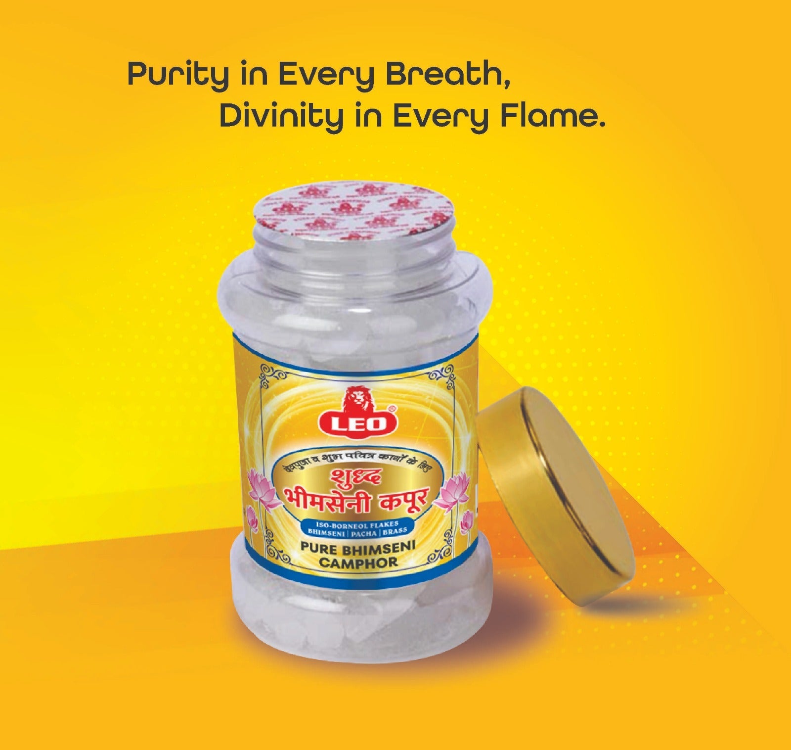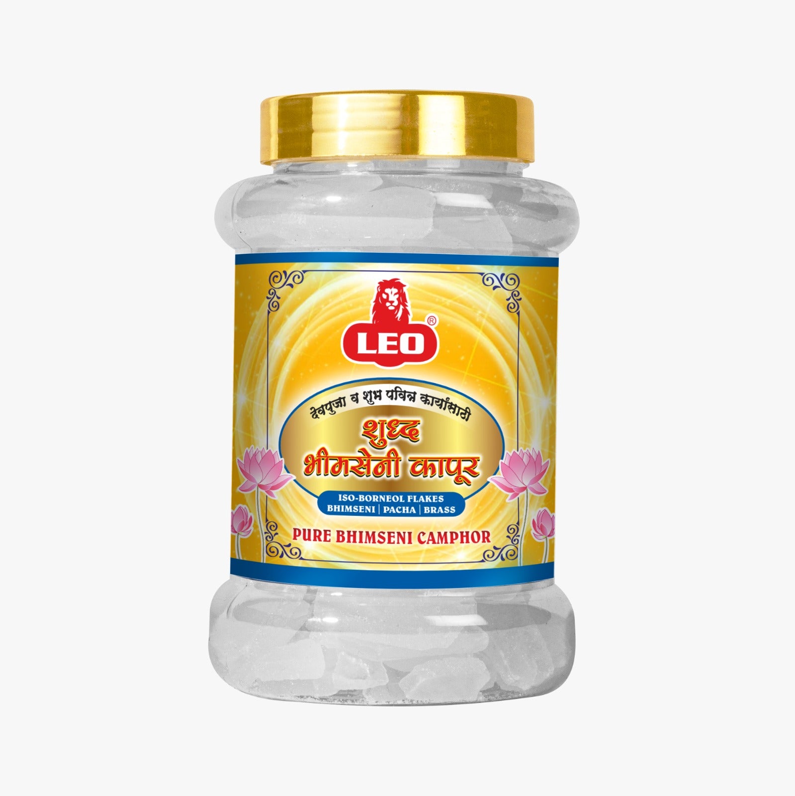 Premium quality LEO Bhimseni Camphor (Iso Borneol Flakes) in a 250g jar pack. Known for its strong natural aroma, ideal for pooja, meditation, and spiritual rituals to create a calm and purified environment.